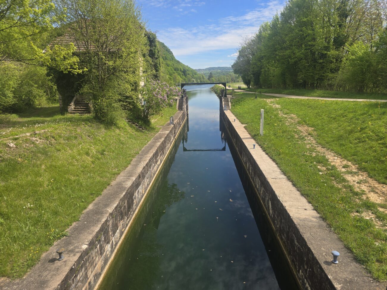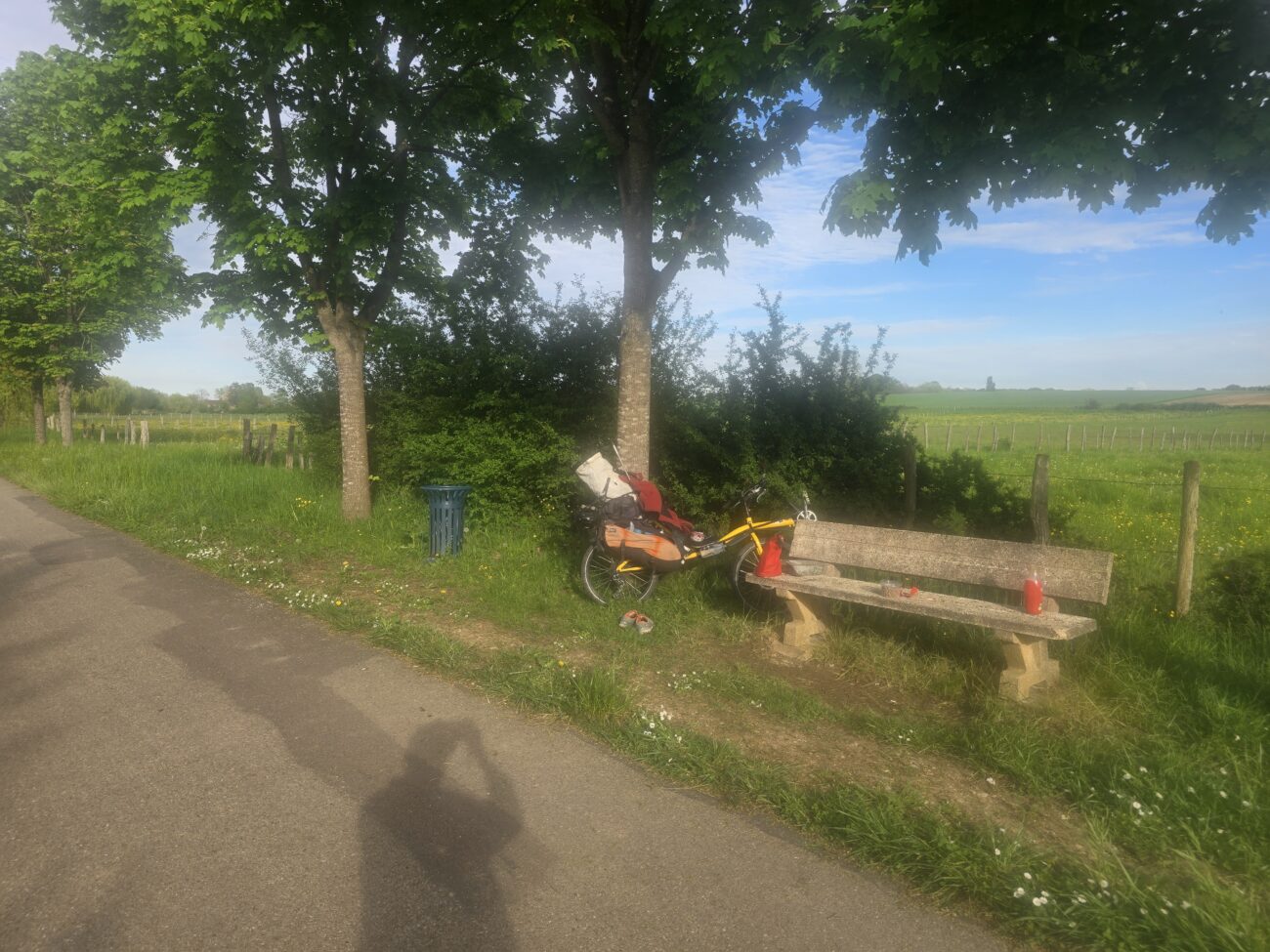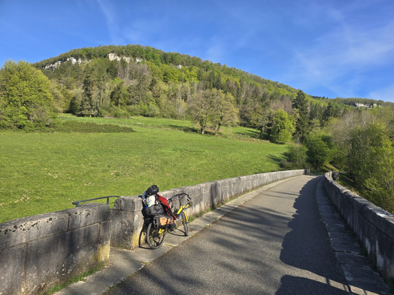 Unter der Brücke habe ich eine angenehme Nacht verbracht. Wieder auf zur Straße war anstrengend aber auch gut geschafft. Dann bin ich losgefahren auf der Straße, die genau mit 2% Steigung schön regelmäßig anstieg, das heißt, es war eine ehemalige Eisenbahnlinie. Nach etwa 2 Km plötzlich. Große Krachen hinten. Als ich dann nachgeschaut habe, habe ich gesehen, dass Wechselrauge abgebrochen war. Das ist ja nun ein ganz kleines Teil, aber es ist nicht einfach zu bekommen. Und schon gar nicht da, wo ich mein Problem hatte, nämlich auf der Fahrradstrasse. Wo kein Auto durchfuhr? Und auch sonst niemand. Aber da beginnen die glücklichen Zufälle. Kaum habe ich den Schaden festgestellt kommt ein kleiner Kombi, hält an und fragt nach meinem Problem. Er sei Waldarbeiten aber natürlich kann er mich zurückfahren, nach Ornans, dort gibts den einzigen Fahrradladen in der Gegend. Also zurück. Der Fahrradladen macht erst um zehn Uhr auf. Also nehme ich mein Frühstück hervor. Und setze mich hin. Aber kaum hingesetzt macht einer das Tor auf vom Fahrradladen. Er schaut sich das Problem an. Nein, so ein Teil hab ich nicht. Aber vielleicht was Ähnliches. Nach einer Weile kommt er daraus mit drei Teilen. Und eines Passt ungefähr. Er ändert dies noch ein bisschen ab dass es dann wirklich passt. Eingebaut ist es schnell. Und ich mache mich wieder. Auf den Weg. 1 Stunde 40 Minuten nachdem ich am Morgen losgefahren bin, bin ich wieder auf der Brücke unter der ich geschlafen habe. Eigentlich habe ich damit gerechnet. Das ich meine Reise hier für längere Zeit unterbrechen muss. Die Strecke ist wirklich wunderschön. Den Aufstieg mache ich auf der Bahnstrecke und bald komme ich anden Doubs. Ich will heute viele Kilometer hinter mich bringen. Denn am Sonntag soll es am Abend regnen. Ich habe einen Warmschauergastgeber. Aber bis dahin sind es noch 190 km. Es wäre schön wenn ich den noch trocken erreichen könnte. Zügig fahre ich dem Doubs, Kanälen und der Saône entlang und mache erst nach 93km halt. Neben dem Radweg stelle ich mein Zelt auf.