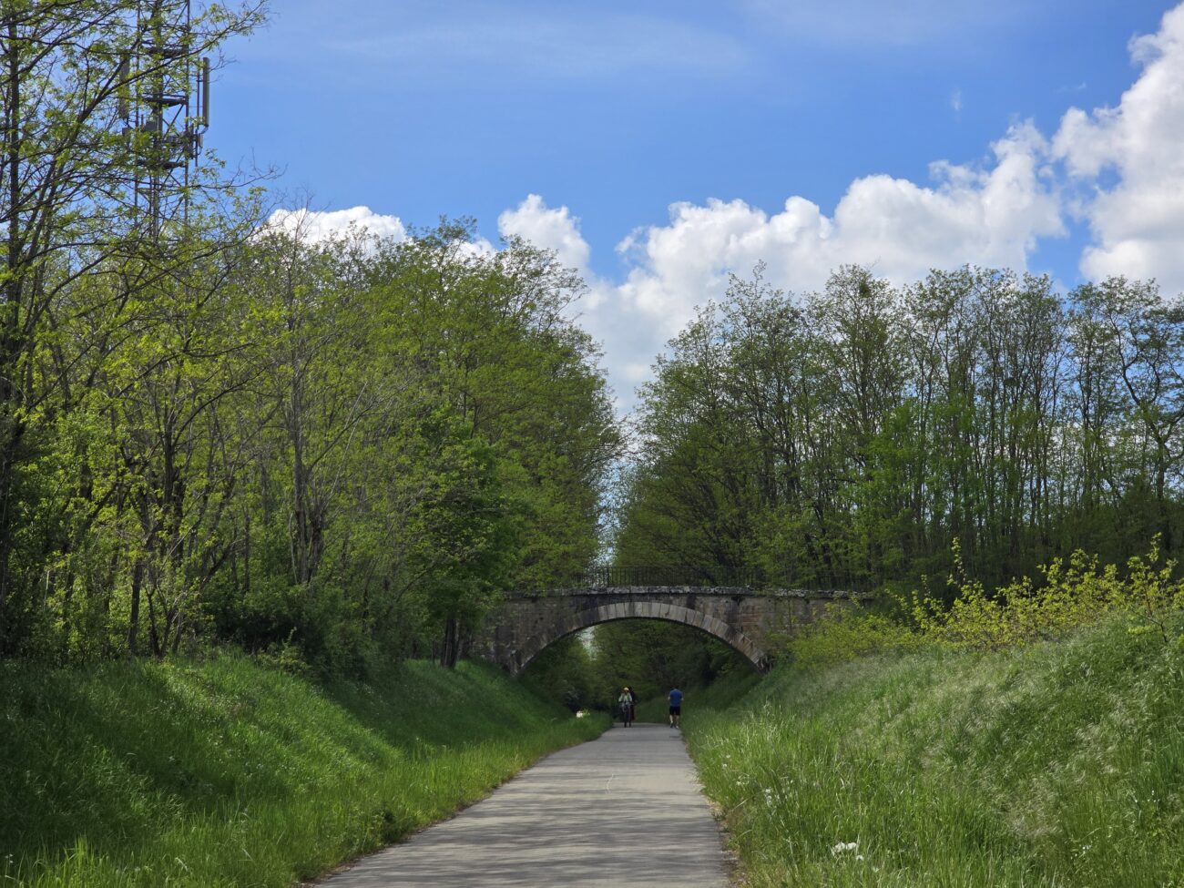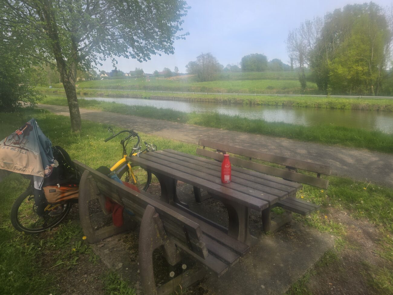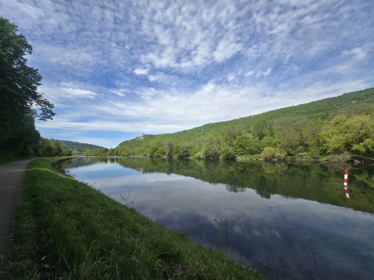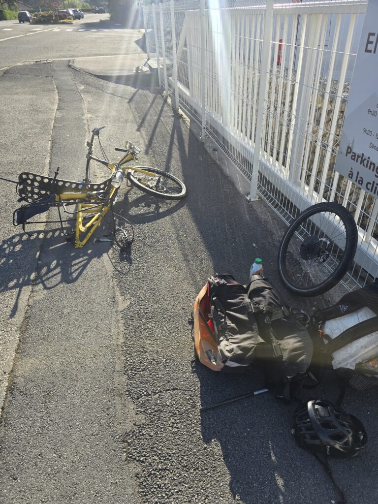 Unter der Brücke habe ich eine angenehme Nacht verbracht. Wieder auf zur Straße war anstrengend aber auch gut geschafft. Dann bin ich losgefahren auf der Straße, die genau mit 2% Steigung schön regelmäßig anstieg, das heißt, es war eine ehemalige Eisenbahnlinie. Nach etwa 2 Km plötzlich. Große Krachen hinten. Als ich dann nachgeschaut habe, habe ich gesehen, dass Wechselrauge abgebrochen war. Das ist ja nun ein ganz kleines Teil, aber es ist nicht einfach zu bekommen. Und schon gar nicht da, wo ich mein Problem hatte, nämlich auf der Fahrradstrasse. Wo kein Auto durchfuhr? Und auch sonst niemand. Aber da beginnen die glücklichen Zufälle. Kaum habe ich den Schaden festgestellt kommt ein kleiner Kombi, hält an und fragt nach meinem Problem. Er sei Waldarbeiten aber natürlich kann er mich zurückfahren, nach Ornans, dort gibts den einzigen Fahrradladen in der Gegend. Also zurück. Der Fahrradladen macht erst um zehn Uhr auf. Also nehme ich mein Frühstück hervor. Und setze mich hin. Aber kaum hingesetzt macht einer das Tor auf vom Fahrradladen. Er schaut sich das Problem an. Nein, so ein Teil hab ich nicht. Aber vielleicht was Ähnliches. Nach einer Weile kommt er daraus mit drei Teilen. Und eines Passt ungefähr. Er ändert dies noch ein bisschen ab dass es dann wirklich passt. Eingebaut ist es schnell. Und ich mache mich wieder. Auf den Weg. 1 Stunde 40 Minuten nachdem ich am Morgen losgefahren bin, bin ich wieder auf der Brücke unter der ich geschlafen habe. Eigentlich habe ich damit gerechnet. Das ich meine Reise hier für längere Zeit unterbrechen muss. Die Strecke ist wirklich wunderschön. Den Aufstieg mache ich auf der Bahnstrecke und bald komme ich anden Doubs. Ich will heute viele Kilometer hinter mich bringen. Denn am Sonntag soll es am Abend regnen. Ich habe einen Warmschauergastgeber. Aber bis dahin sind es noch 190 km. Es wäre schön wenn ich den noch trocken erreichen könnte. Zügig fahre ich dem Doubs, Kanälen und der Saône entlang und mache erst nach 93km halt. Neben dem Radweg stelle ich mein Zelt auf.